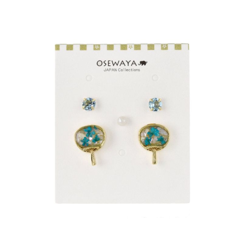 jj0031花柄のちいさな団扇がとってもかわいい、カラーストーンとパールもついたセットピアス。浴衣や着物などのイベントコーデにも◎