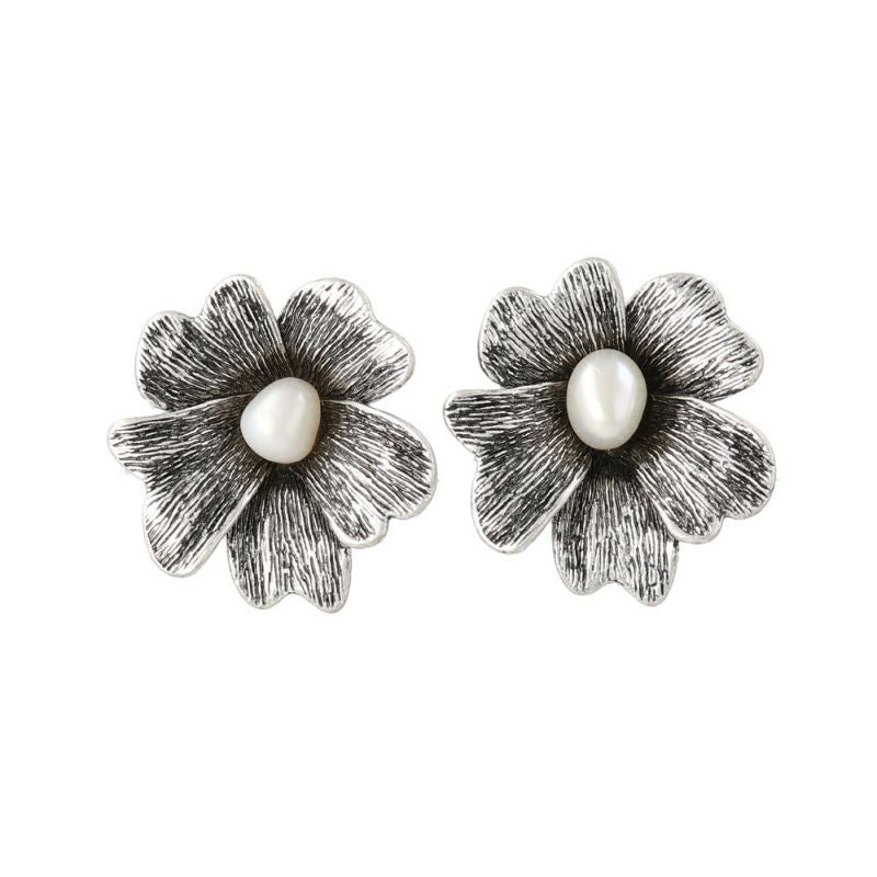 【LIMITED NUMBER】Vintage Like イヤリング ニッケルフリー メタル 淡水パール フラワー クリップイヤリング シリコンカバー付き