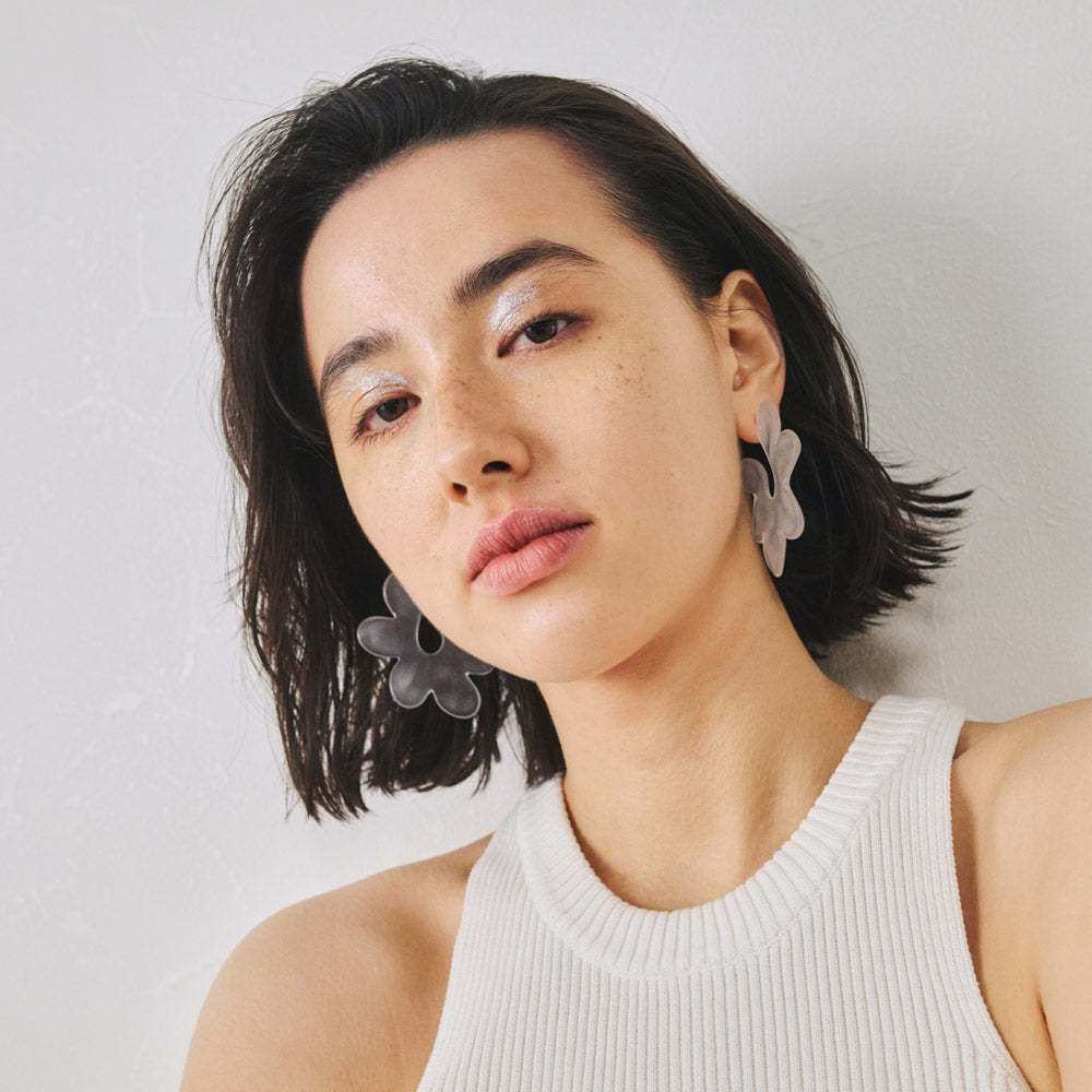 【LIMITED NUMBER】MELLOW ピアス メタル マット クリア カラー ホマイカ ビッグ フラワー サイド チタンポスト C型 スタッドピアス