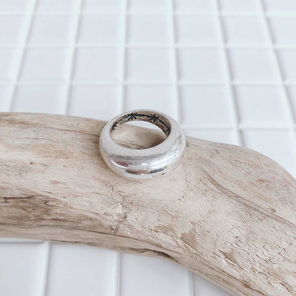 メンズライクなシルエットやネイティブな模様をあしらったデザインは、墨入り加工でメリハリをつけたヴィンテージな風合いが特徴。着けすぎくらいがちょうどいい、自由なレイヤードスタイルが楽しめるリングです。